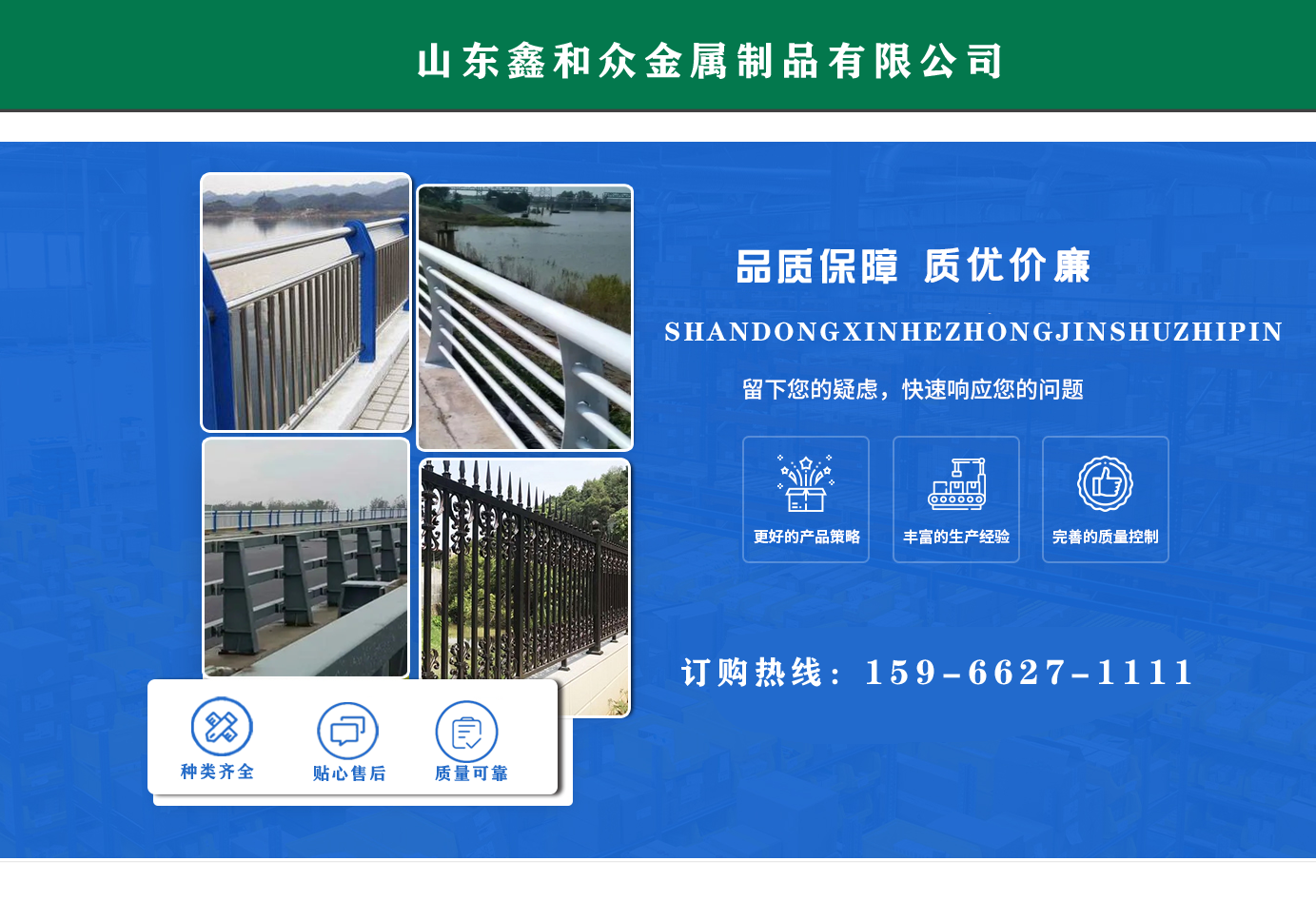 山東鑫和眾金屬制品有限公司主要產(chǎn)品有防撞護(hù)欄,橋梁護(hù)欄,道路護(hù)欄,河道護(hù)欄,不銹鋼護(hù)欄等護(hù)欄。提供設(shè)計(jì)方案,一站式定制,包您滿意價(jià)格優(yōu)惠,歡迎來電咨詢! 公司常年從事銷售護(hù)欄防撞護(hù)欄,橋梁護(hù)欄,道路護(hù)欄,河道護(hù)欄,不銹鋼護(hù)欄,橋梁鋼護(hù)欄,河道燈光護(hù)欄等。產(chǎn)品廣泛應(yīng)用于橋梁、河道、旅游景區(qū)、道路、公路、公園、小區(qū)、景觀、道路防撞等領(lǐng)域?! 」井a(chǎn)品均采用優(yōu)質(zhì)不銹鋼材料,符合相關(guān)標(biāo)準(zhǔn)。各種型號(hào)不銹鋼復(fù)合管及護(hù)欄,質(zhì)量嚴(yán)格把控。產(chǎn)品強(qiáng)度高、耐腐蝕、焊接牢固、抗沖擊、性能好,防撞護(hù)欄結(jié)構(gòu)簡(jiǎn)單、美觀實(shí)用大方。 歡迎前來訂購!...